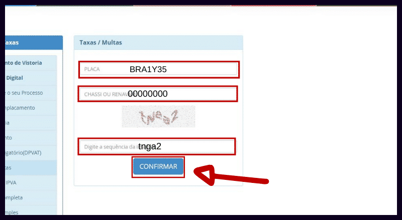 - Informe o número do chassi do veículo ou a placa e o RENAVAM;