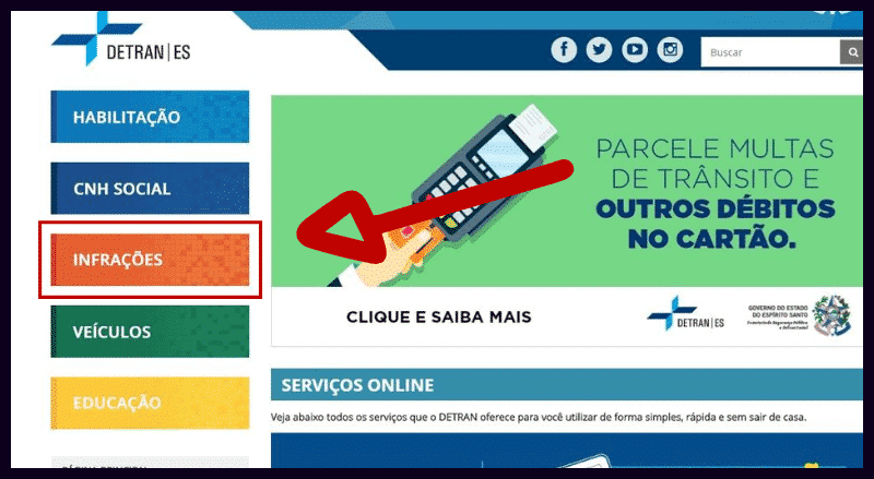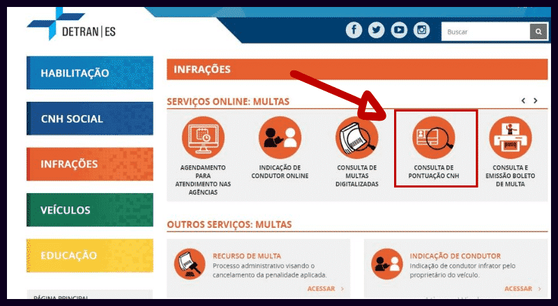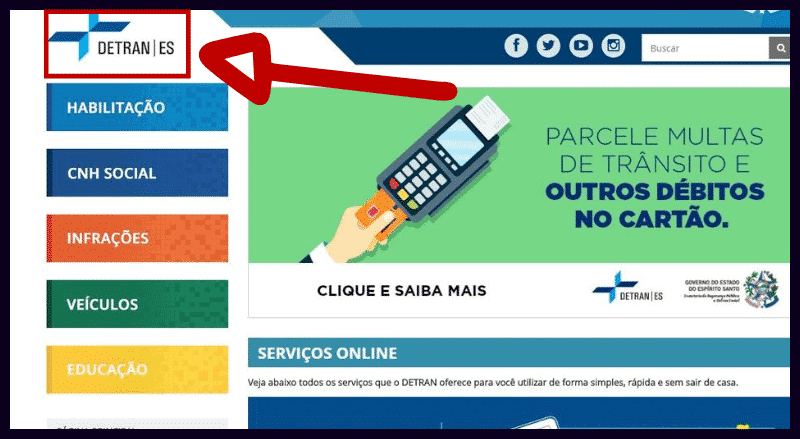 1-Na página principal de serviços online do site do DETRAN ES, siga as orientações da seguinte forma para consultar;