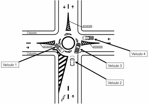 Os veículos 1, 2, 3 e 4 transitam por fluxos que se cruzam, porém não sinalizados. De acordo com a ilustração acima, os veículos que possuem preferência de passagem sobre os demais sãoA | 1 e 2 |
